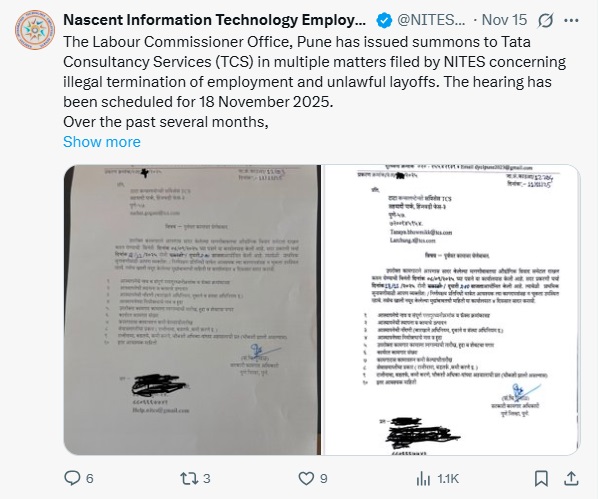“Over the past several months, NITES has received a large number of complaints from TCS employees across various locations regarding abrupt terminations, forced resignations, denial of statutory dues, and coercive employment practices. After reviewing the grievances and supporting documents, NITES assisted the affected employees in filing formal complaints before the competent authority,” NITES posted on X on November 15, 2025.