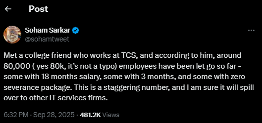 An X user named Soham Sarkar claimed that his college friend, who has reportedly worked at TCS for 15 years, said that around 80,000 employees were asked to resign. Some reportedly received 18 months of severance pay, while others received as little as three months of termination pay, and some received no compensation at all.